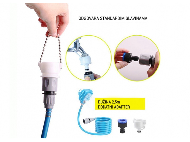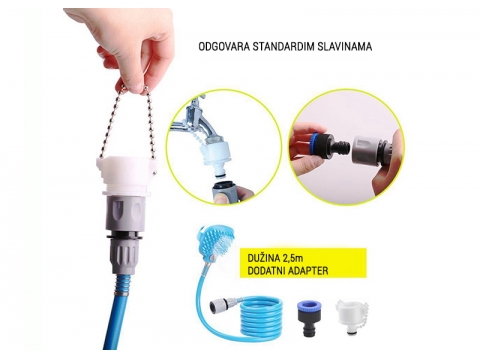 U pakovanju sa crevom i prskalicom dobijate adaptere zahvaljujući kojima ćete moći da ga povežete i na tuš i na baštensko crevo. Dužina creva: 2,5m