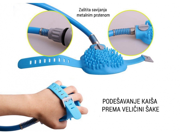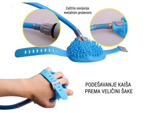 Ono što je takođe praktično kod ovog creva je način na koji se aktivira voda: pritiskom prstiju na sredinu prskalice! Ne morate da skidate prskalicu koju ste fiksirali za ruku, sapunjate psa, pa je ponovo navlačite. Samo kliknete kada želite da isključite/uključite vodu. Prskalica vam, dakle, neće smetati na ruci prilikom pranja, čak će vam i pomoći da detaljnije i lakše okupate psa.