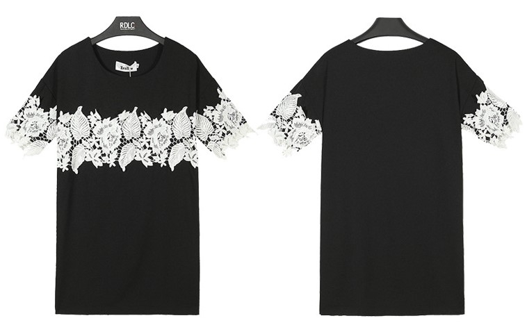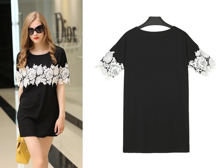 Interesantan je kontrast između crne haljine i bele čipke. Crni deo vas vizuelno sužava, a beli deo čini da vam grudi izgledjau malo veće nego što jesu. Pošto je kratka, gornji deo je zatvoren kako bi se postigao balans.