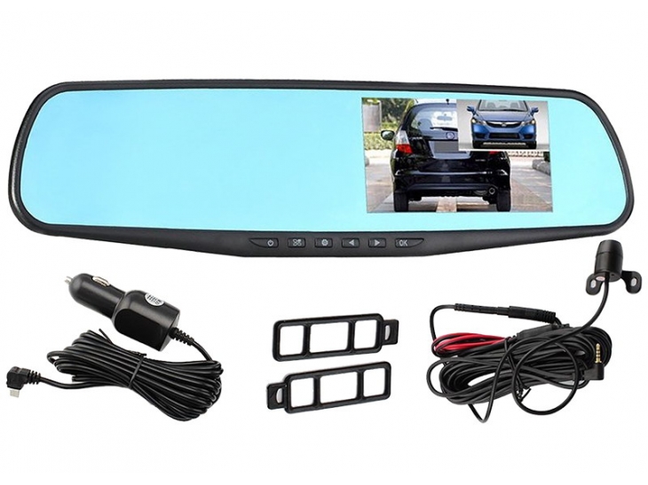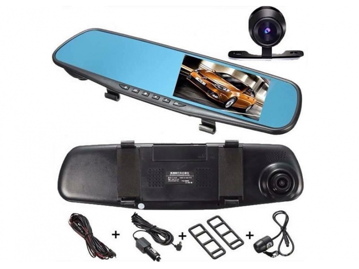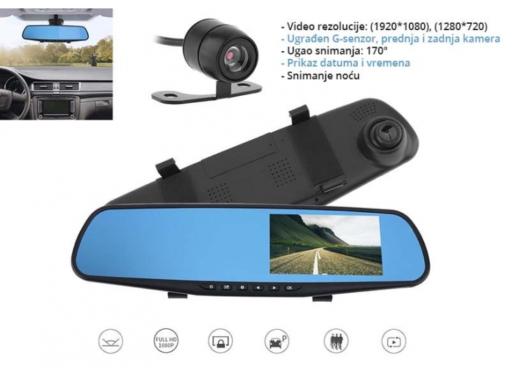 Ovaj unutrašnji retrovizor sa kamerom je nešto što bi svaki vozač trebalo da ima u svom autu. On je u isto vreme retrovizor, DVR snimač vožnje, kamera i plus uz nju dolazi i kamera za snimanje vožnje u rikverc. Veličina ekrana na ogledalu 4 inča. U sebi takođe ima ugrađen i mikrofon koji se po želji može i isključiti.
