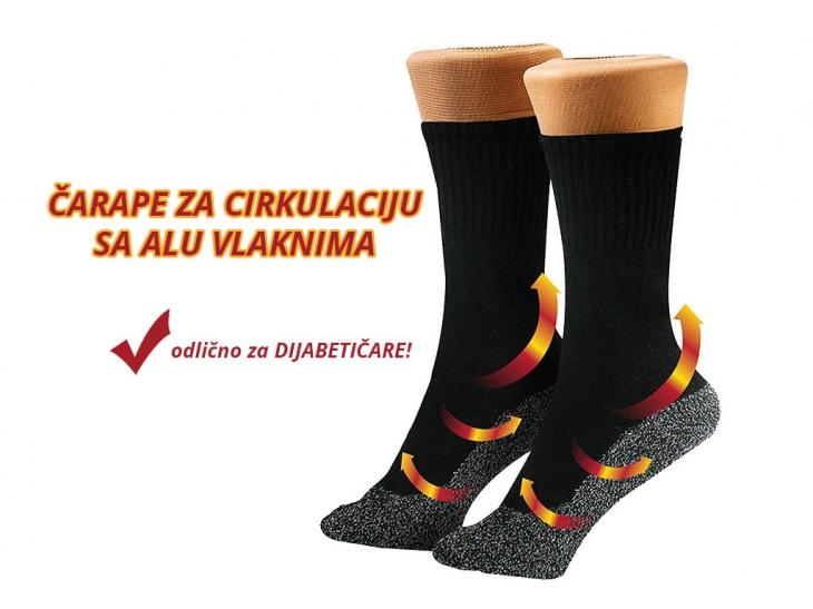 Ove specijalne čarape za regulisanje cirkulacije oduševile su svakoga ko ih je probao. Izuzetno su kvalitetne, udobne, prijatne i pozitivno utiču na cirkulaciju. Greju zahvaljujući aluminijumskim vlaknima, a ne debljini, pa se zbog toga mogu nositi u bilo kojoj obući a da ni malo ne smetaju.