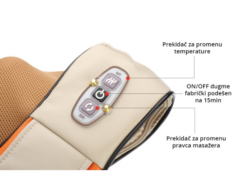 Možete se masirati njime i dok je uključen u struju, ali ga možete poneti i na put i masirati se u autu. Infracrveno svetlo opušta mišiće i poboljšava efekat masaže, a vi ga po želji možete uključiti ili isključiti. Fabrički je podešeno da masažer prestaje sa tretmanom 15 minuta od početka rada. Svakako, vi je pritiskom na dugme možete produžiti ili je skratiti.