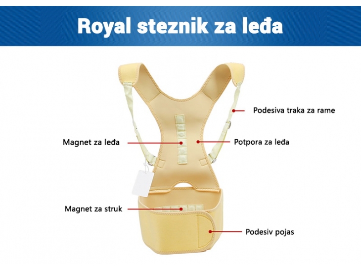 Royal steznik pomaže pravilnom držanju kičme i ublažava bolove u gornjem delu leđa i lumbalnom delu. Za optimalne rezultate nositi 4-6 sati dnevno.